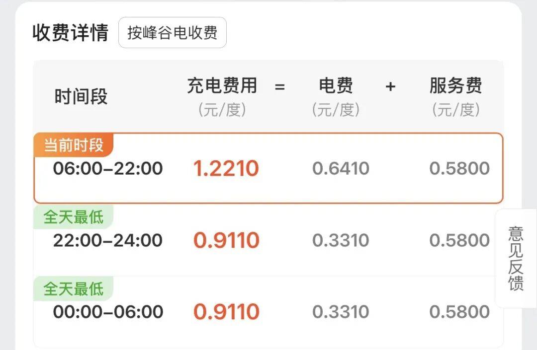万桩也有按充电时长收费的模式。比如,在张江的一个充电点位,1元充4小时,2元充8小时,3元充12小时。切换到华侨公寓点位后,收费模式变成按峰谷电收费,页面显示,6:00~22:00的充电费用为1.221元/度,其余时间段为0.911元/度,包括电费和服务费。
