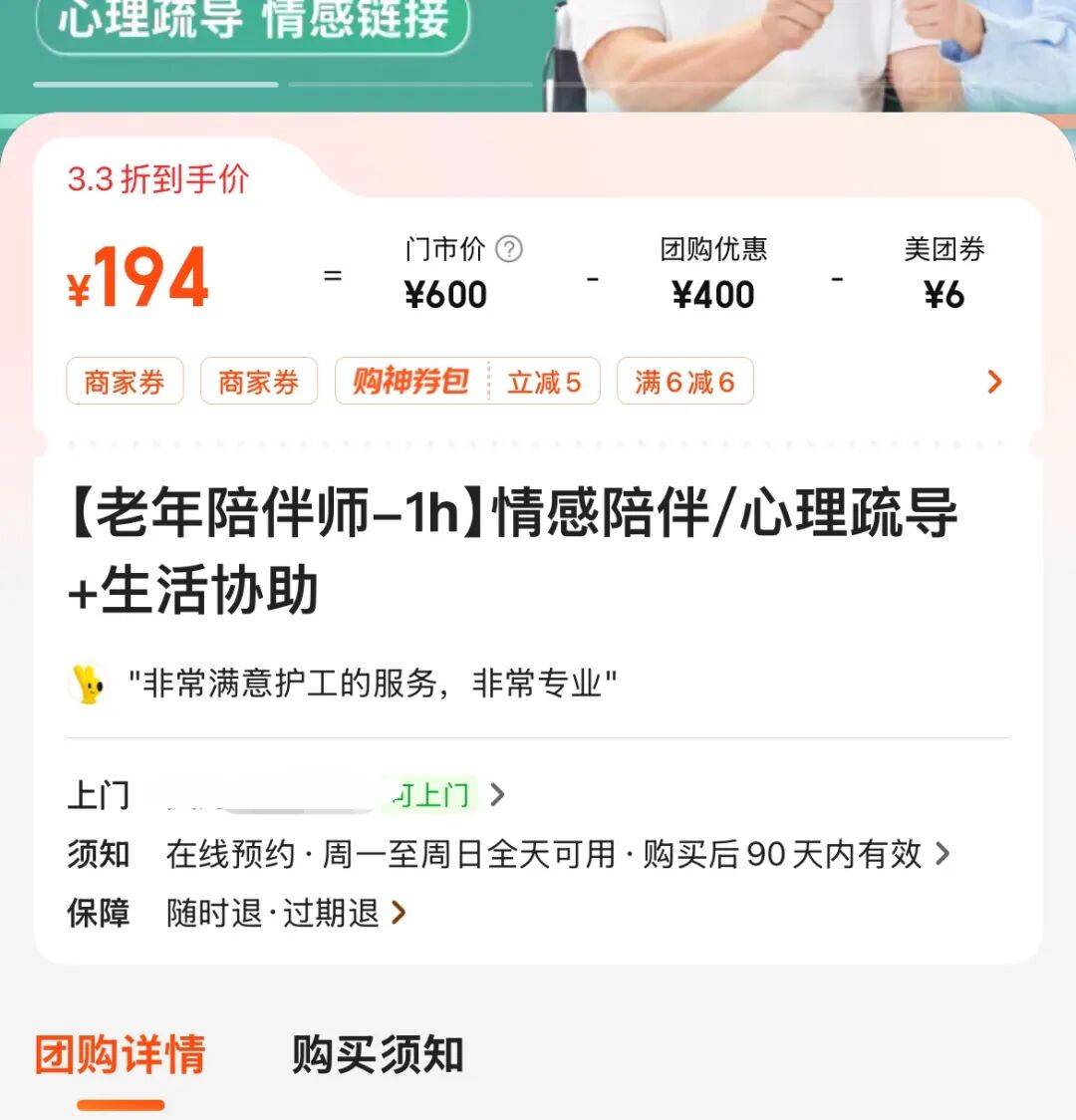 在团购平台上,深圳一家陪护机构挂出了“老年陪伴师”服务,服务内容包含情感陪伴、心理疏导、生活协助等。客服人员跟我分享了两个过往的服务案例,一个是陪老人逛街,一个是陪伴认知能力退化的老人,陪伴师通过互动和小游戏,帮助老人做认知上的康复训练。
