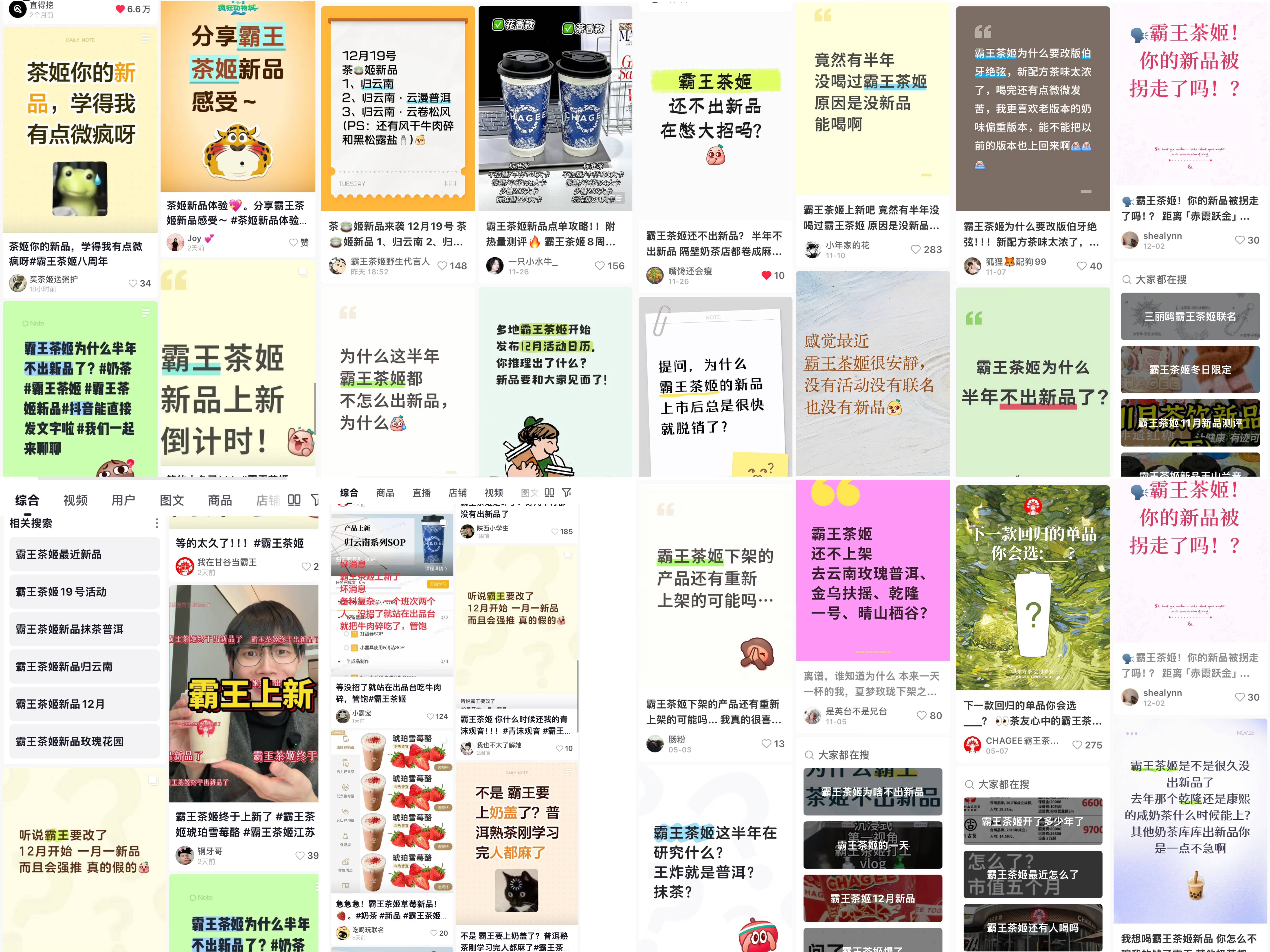 图为抖音、小红书等社媒今年围绕“霸王茶姬新品”的话题帖