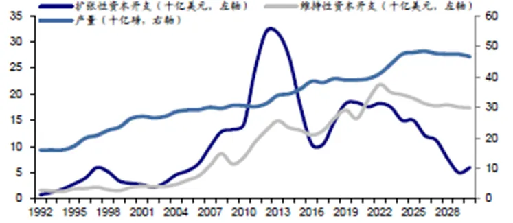 资本开支不足(一半左右还为维护性),导致新增产能有限。2010 - 2020 年全球资源类资本开支持续低迷,尽管 2020 年后有所回升,但新增产能释放滞后,预计供给高峰将出现在 2028年后,且增产幅度有限。
