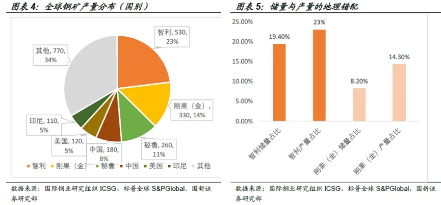 作为核心的大宗工业金属,铜的全球地理错配现象也非常严重。全球近10亿吨储量中;储量高度集中,智利/秘鲁/刚果(金)重要性高,中国虽然需求高达50%以上,但储量占比仅仅只有4%。