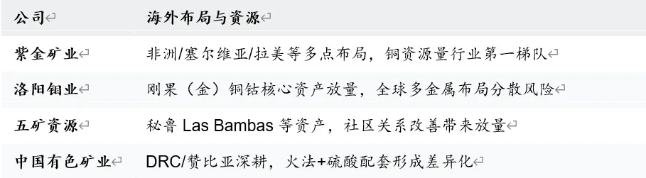 中国是全球最大的制造业产地,国内有色金属储量相对匮乏,如铜精矿对外依存度约 80%。为保障资源安全,我国有色央国企带头出海收购海外优质矿山,足迹遍布刚果金、澳大利亚、秘鲁等资源富集国。紫金矿业收购塞尔维亚 Timok 铜金矿、五矿集团拿下秘鲁 Las Bambas 铜矿等,构建了自主可控的全球供应链体系。