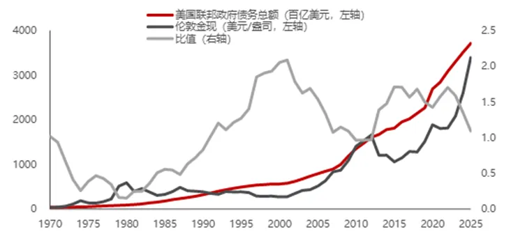 图:美国外债总额及金价比值来源:民生证券