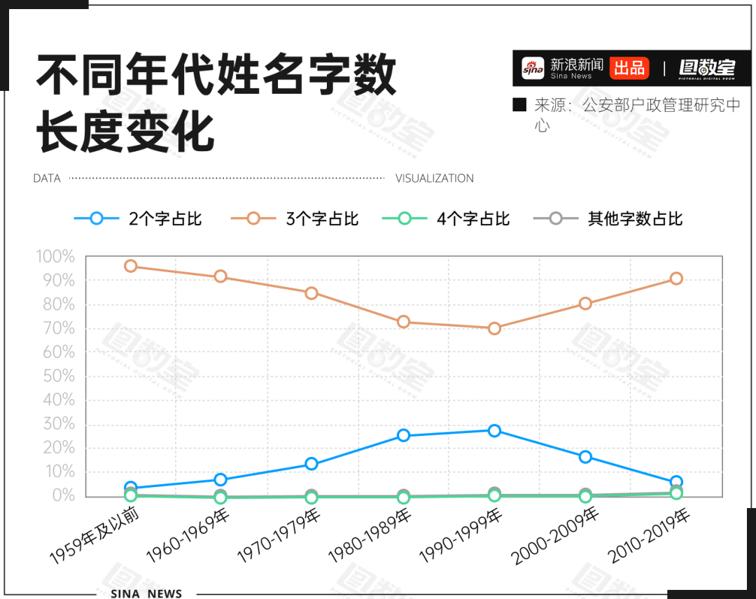 有趣的是,四字及其他字数姓名虽使用人数较少,但一直保持增长态势,比如有的家庭会将父母姓氏结合,组成像“张杨悦兮”这样的四字名,也有一些传统文化爱好者,会为孩子取更具古典韵味的复姓双名。而四字名字的占比,也由上世纪五十年代的0.3%、0.4%提高到目前的1.6%和1.7%。