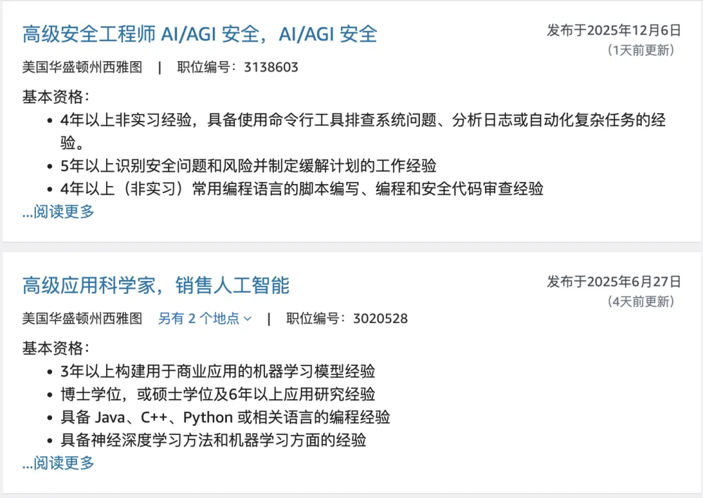 万人大裁员的同时,亚马逊还宣布对AWS投资500亿美元,用于扩建AI和基础设施。目前,在“亚马逊将在明年1月实行下一轮万人大裁员”的风声下,其官网依然挂出了机器学习顾问、AI应用科学家等多个AI相关职位。