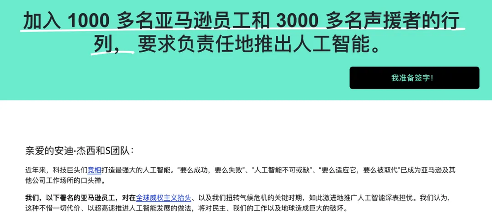 11月底,据英国《卫报》报道,超过1000名亚马逊员工联合发布匿名公开信,对公司加速推进AI的方式提出强烈质疑。公开信由 “亚马逊气候正义员工联盟 ”成员组织,参与联署的员工包括工程师、产品经理、仓库员工等不同岗位。此外,Meta、谷歌、苹果与微软等公司的超过2400名员工也表达了支持。