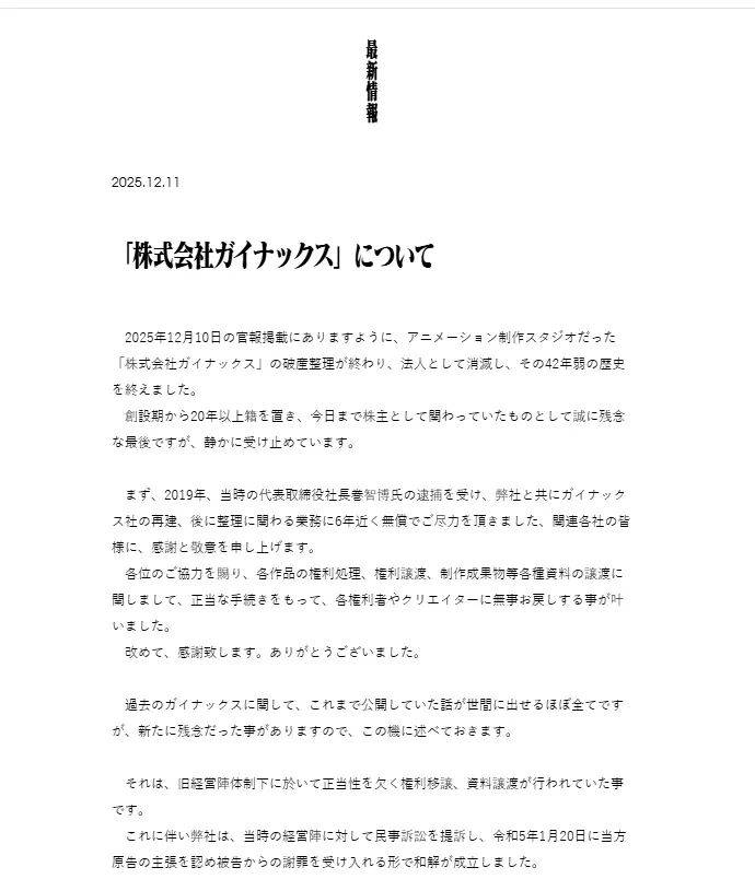 日本动画公司“GAINAX”今日发布,公司已完成破产整理正式解散,结束其近42年的历史。