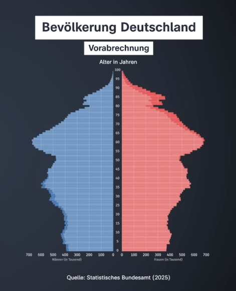 从上面这张德国人口年龄分布图上(蓝色为男性,红色为女性)可以看出,60多岁的、也就是即将进入退休阶段的人数,处于一个峰值。