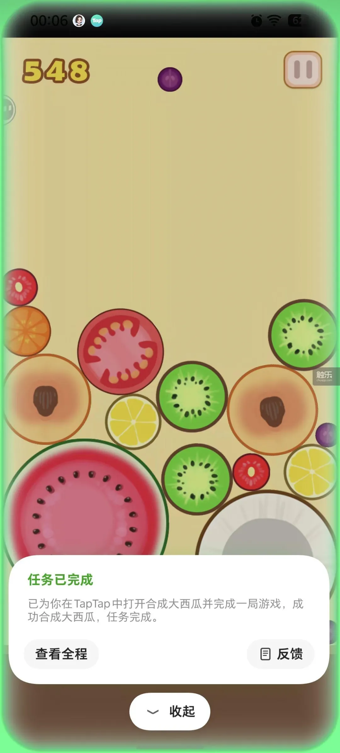 我尝试让豆包玩更简单的《合成大西瓜》。我对它说:“为我合成西瓜。”在这款游戏中,豆包的屏幕识别和点击能力得到了不错的发挥,它很快理解了如何让水果合成,并能精确找到下落位置,让两个相同的水果撞在一起。27分钟后,豆包成功合成出大西瓜。