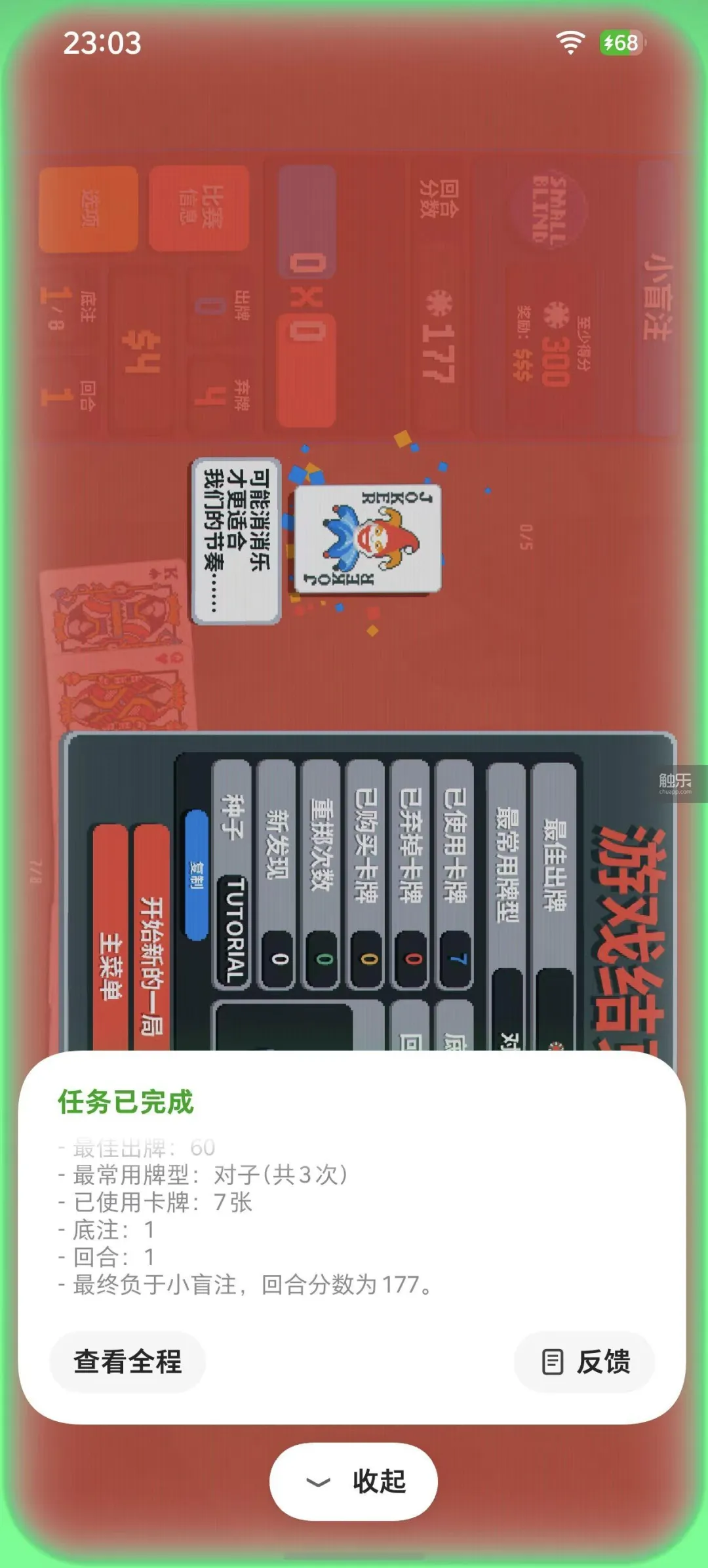 那就玩玩吧。只是豆包的游戏表现出乎意料的差劲,它似乎完全理解不了《小丑牌》的规则,即便它刚刚阅读完游戏新手引导。在连续出了3次对子牌后,分数停留在177分,游戏结束在“回合1,底注1”。一旁的小丑还适逢其时地嘲笑道:“可能消消乐才更适合我们的节奏……”