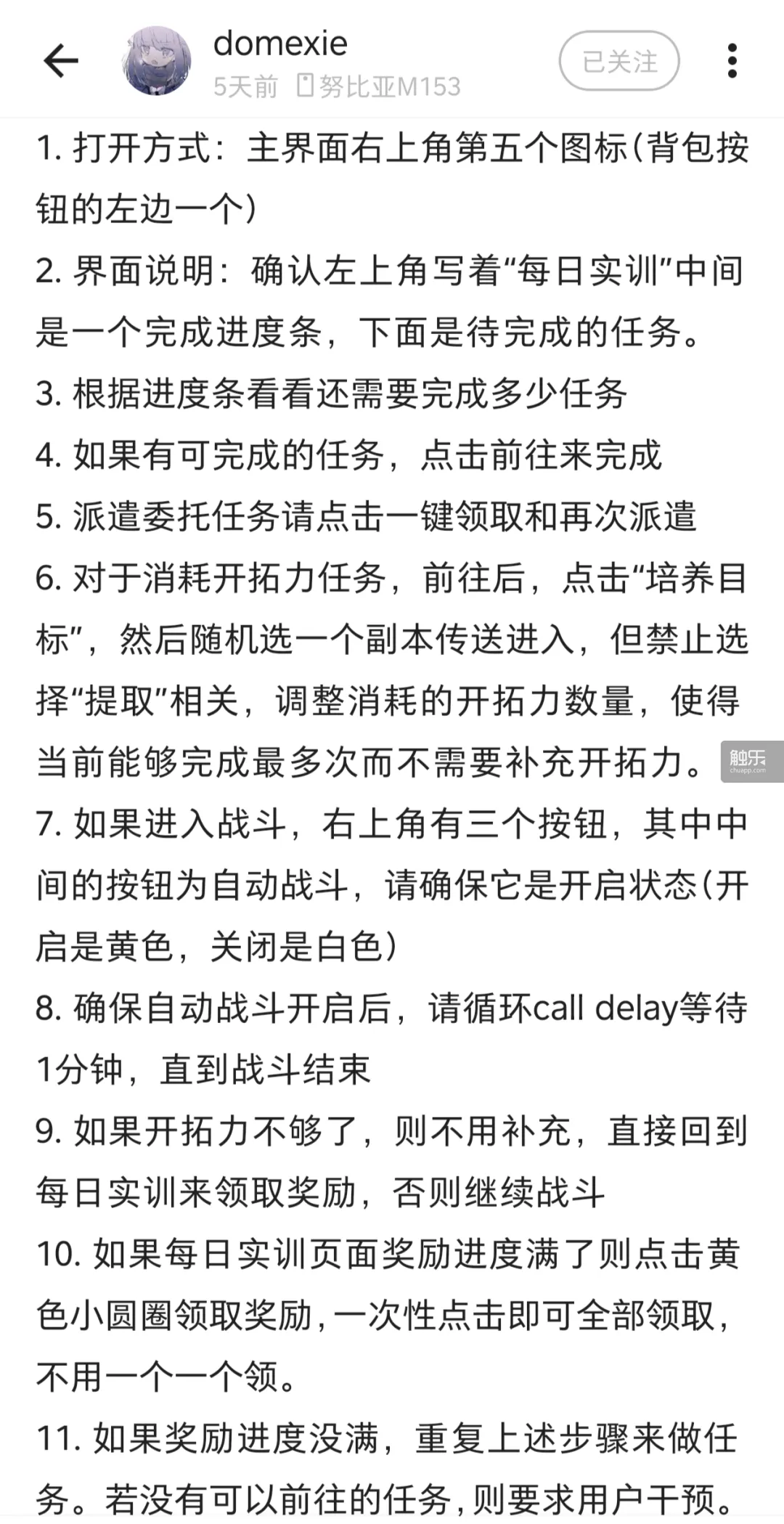 在酷安社区的“豆包手机”交流板块,一位叫“domexie”的用户分享出自己研究两天,利用“豆包手机”自动完成某些游戏每日实训的提示词(Prompt)。全文407个字,共计11个连续步骤,提示词精确到每个点击步骤和按键功能。