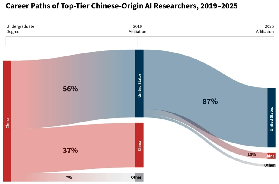 图一:2019–2025年,顶尖中国籍AI研究人员的职业路径。