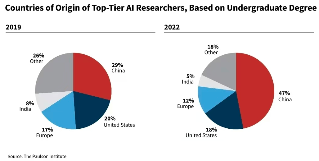 图三:顶尖AI研究人员的来源国(基于本科教育背景)。来源:保尔森基金会