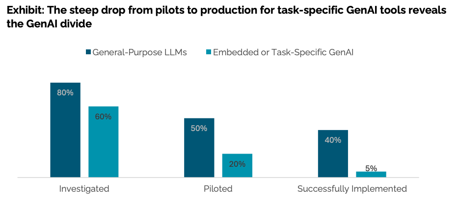 企业在生成式AI上“兴趣高,落地少”。任务型生成式AI工具从试点到实际部署的成功率会由20%跌至5%。图源:MIT,The GenAI Divide:State of AI in Business 2025.
