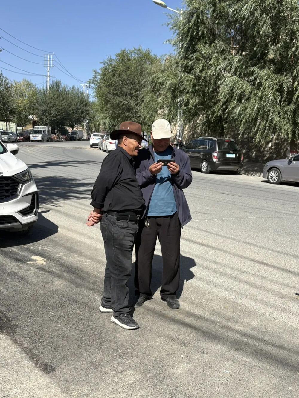 活羊交易一般只在上午进行。这一天,只来了一只羊。五六位收羊人聚在路边,时不时看看手机里牧民发来的牛羊视频,品鉴品鉴,聊聊天。他们不担心生意,这个季节交易一般都在山上进行,年轻人们都去了,可以一次性收上七、八十只甚至上百只羊,牧民们便不再需要来市场了。