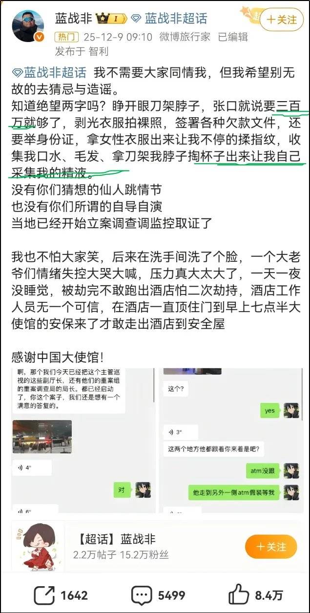之前,蓝战非说的是绑匪只要了300万,但没提自己具体给了多少。