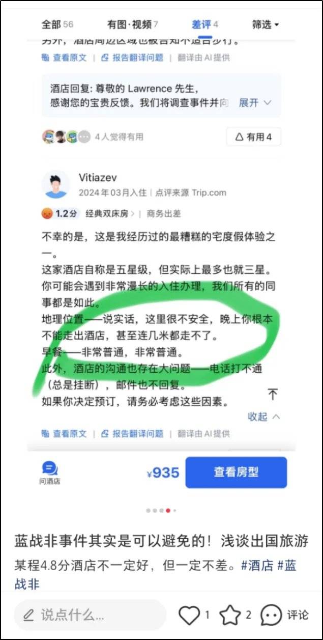 首当其冲的就是涉事的五星级酒店,现在网友会拿零星几条差评说事,而不管是不是选择性偏见了。