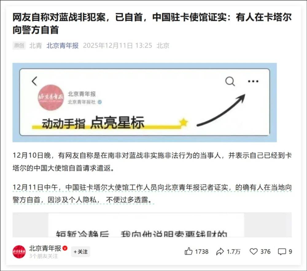 最新消息是,中国驻卡塔尔大使馆说有人来自首了。