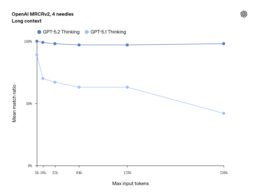 GPT-5.2在长文档理解上也有明显进步。在OpenAI的MRCRv2测试中,它成为首个在256k token长度下,针对4-needle变体任务达到近乎100%准确率的模型。