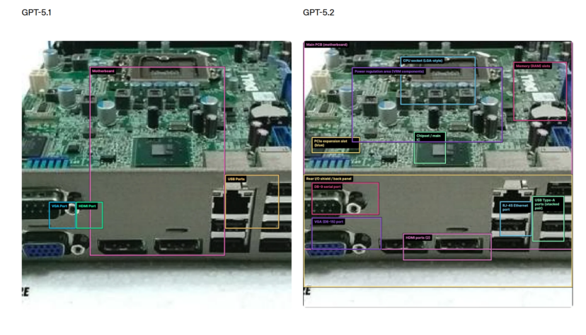 OpenAI展示了一个例子:即使输入一张模糊的主板照片,GPT-5.2也能准确识别出各个组件的位置并标注边界框,而前代模型只能识别出少数部分且位置偏差较大。