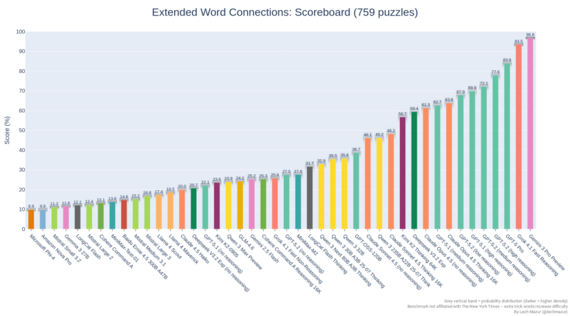 NYT Connections是《纽约时报》推出的一个文字游戏,要求玩家从16个词语中找出四组相关的词汇。这个测试被设计成了一个LLM基准,通过加入额外的干扰词来增加难度,目前包含759个谜题。这种测试考察的是模型对语言的细微理解、联想能力和分类推理。