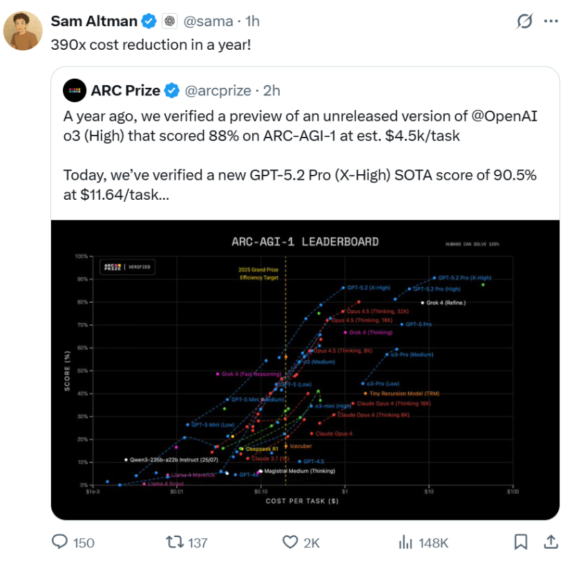 同时这次发布最引人注目的,不仅是模型本身的能力提升,更是一个令人惊讶的效率数据:在ARC-AGI-1测试中,GPT-5.2 Pro实现了约390倍的效率改进。