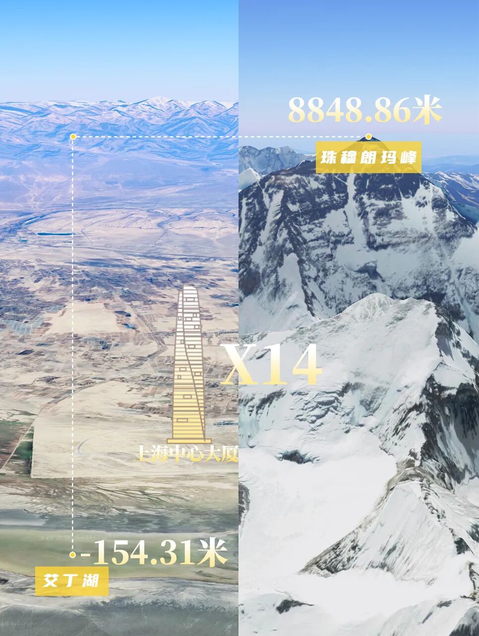 这一高一低,海拔落差足足有9003米,相当于14座上海中心大厦叠起来。