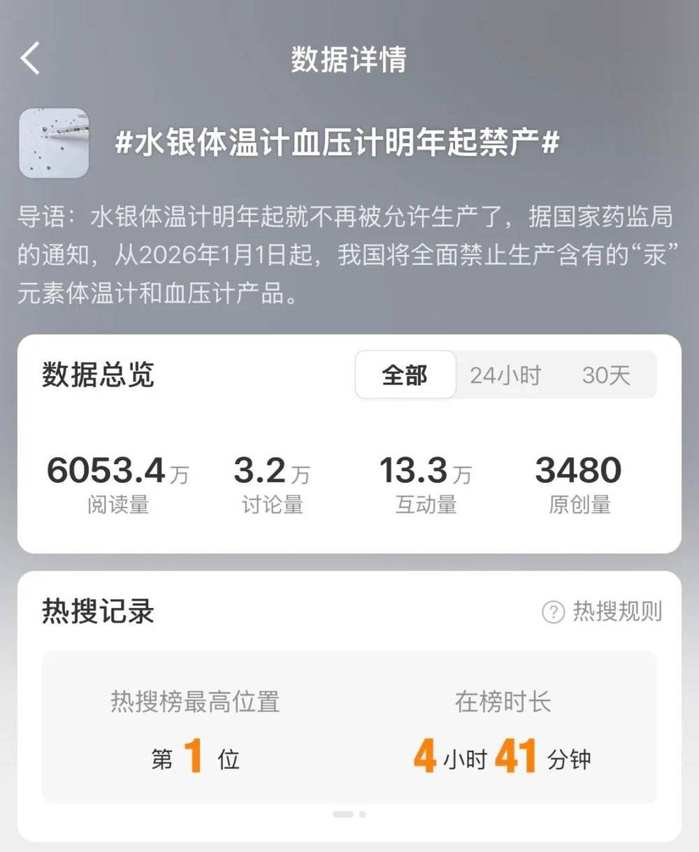 “水银体温计血压计明年起禁产”的话题于近日冲上热搜。从2026年开始,家中常用的水银体温计将退出历史舞台。根据国家药监局综合司关于履行《关于汞的水俣公约》有关事项的通知,自2026年1月1日起,禁止生产含汞体温计和含汞血压计。