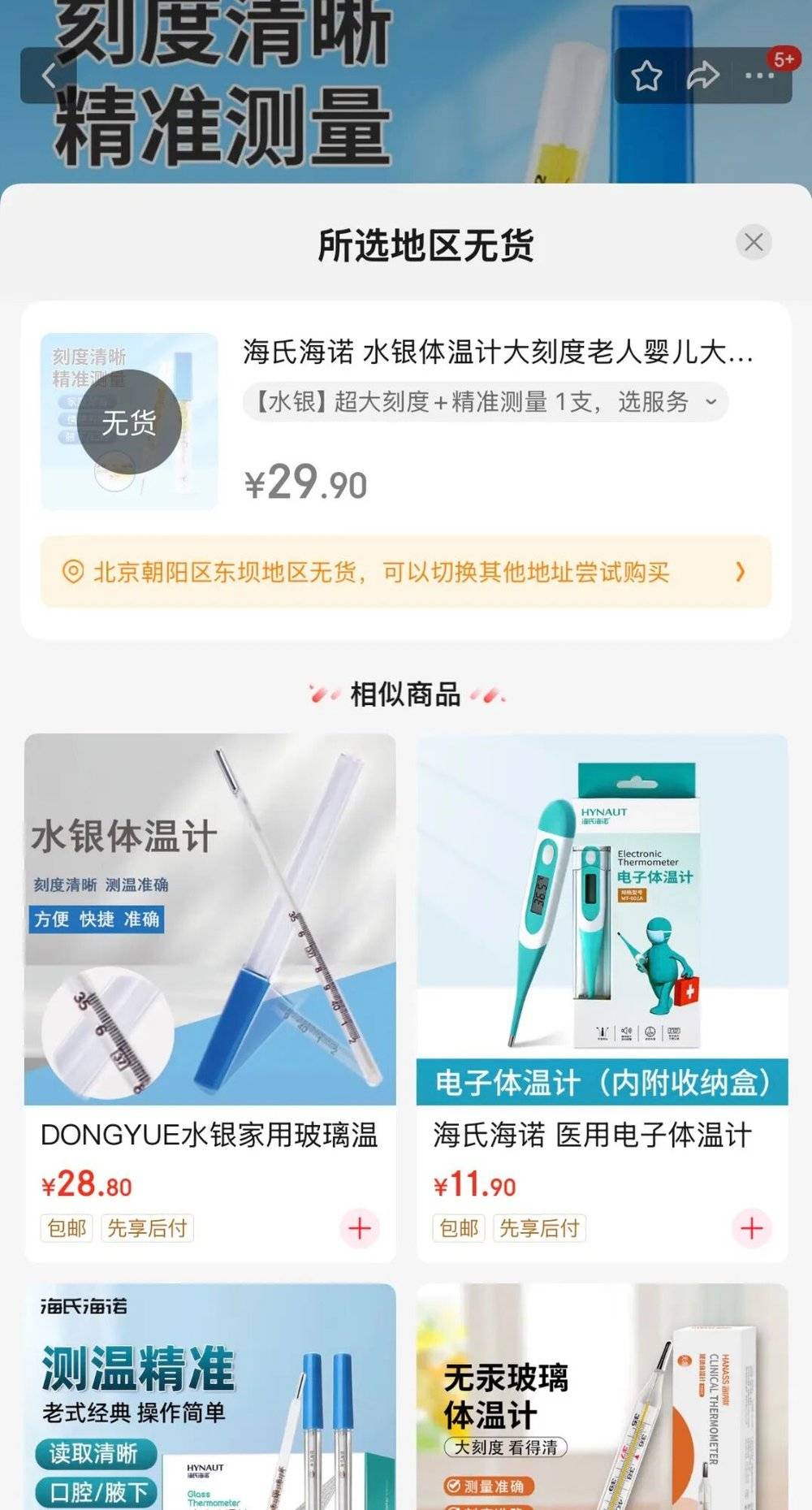 12月10~11日,时代周报记者搜索电商平台发现,在京东、淘宝平台中,水银体温计售价普遍超15元/支,也有商家出现无货。而在即时零售平台美团买药中,有多家药店的水银体温计产品可以购买。