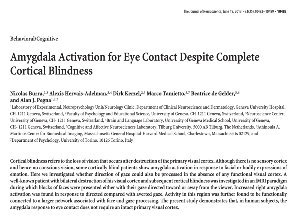 随着更多研究的开展,科学家们愈发确信,视觉皮层并不是唯一能处理视觉输入的大脑区域。2013年,研究人员研究了一些皮层盲患者(也就是视觉皮层被破坏的人),这些人虽然没有有意识的视觉,却在面对情绪面部表情或身体动作时,表现出了杏仁核活动。瑞士日内瓦大学医院的一组研究团队在《神经科学杂志》(The Journal of Neuroscience)发表了一项研究,探讨一位皮层盲患者是否也能感知注视方向。