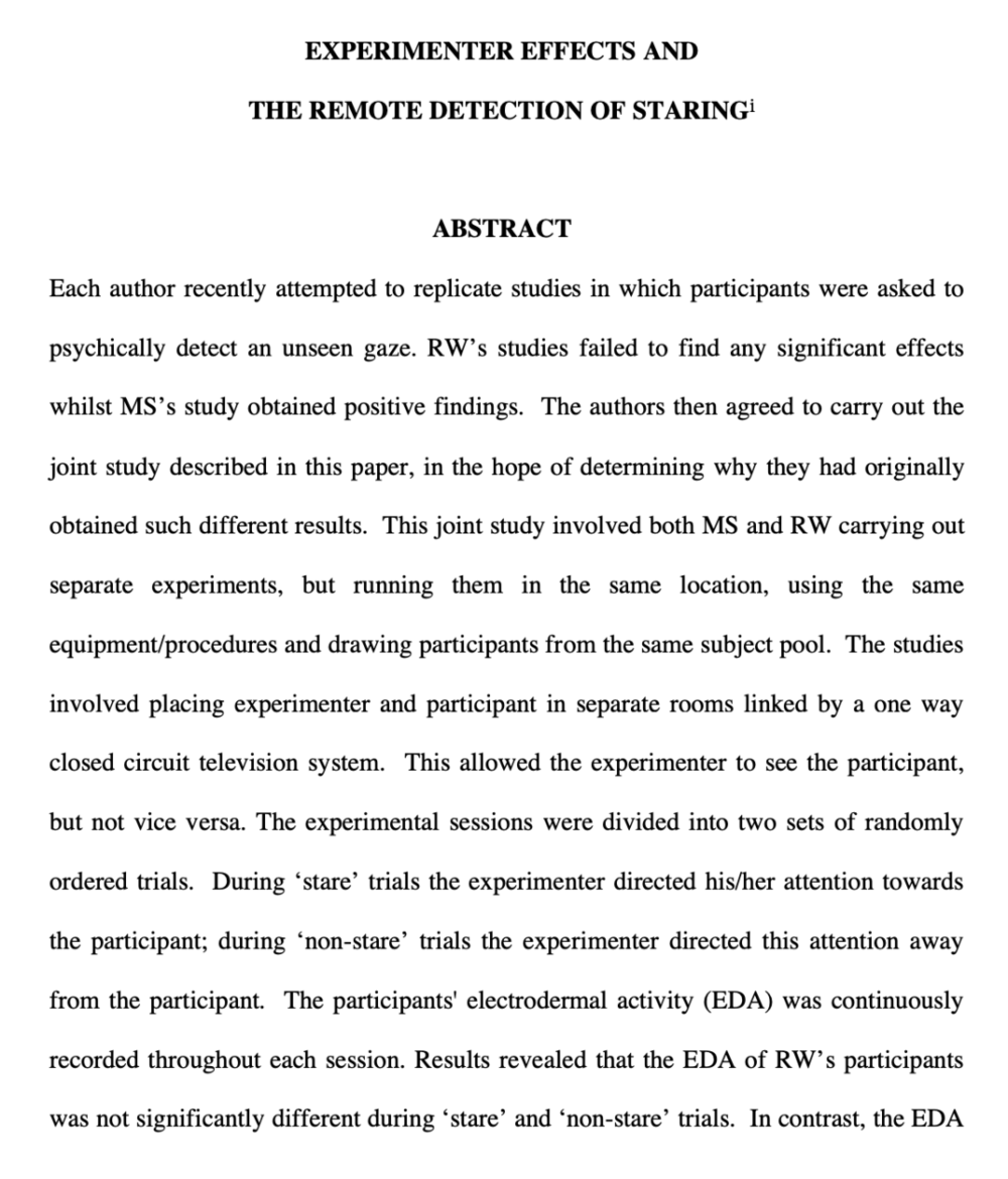 怀斯曼和他的团队在研究中试图寻找这种能力的证据。他们让两名受试者分别待在不同的房间。其中一人被称为“实验者”,通过单向闭路电视系统观察另一人。实验者在研究人员的安排下间歇性地“凝视”被试者,而研究人员则监测被试者的皮肤电反应(EDA,即皮肤电导率的变化)。结果显示,在一组中,被试者在被注视时其EDA并没有显著变化。但在另一组中,被试者在被注视时的EDA却明显升高。怀斯曼和他的团队无法解释为何第二组表现出了这种似乎能察觉到被注视的能力。