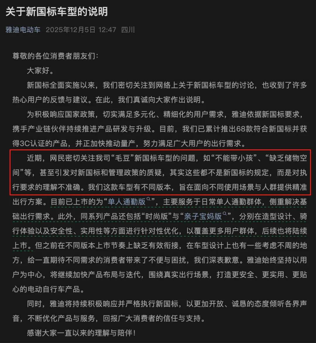 新车引发了外界对雅迪以及新国标的双重争议,在舆论重压之下雅迪后续发表推文说明,表示有关“毛豆”新国标车型的争议设计并非基于新国标规定,而是车企本身对执行要求的理解不准确, 目前公司已经累计推出68款符合新国标并获得3C认证的产品,并且已经加快推动量产。
