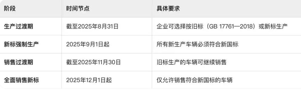 按照新国标落地的标准流程,标准号为GB 17761-2024的《电动自行车安全技术规范》文件于2024年12月31日首次公开,并且同时设定了两个实施时间,其中,生产环节的分界点是2025年9月1日, 企业在这之前仍可自主选择生产新国标产品还是继续保持原有产品线,而销售环节的分界点则是2025年12月1日,通过在旧国标产品停产与新国标产品开售之间设置的3个月缓冲期,品牌方和零售网点依然有足够的时间可以清理库存和重新铺货。