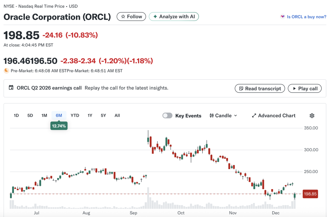 12月10日盘后,甲骨文(ORCL)交出FY2026Q2(截至11月30日)的成绩单,第二天,股价直接砸出一根大阴线。很多人的第一反应是:云还在增长、EPS还挺好看,怎么就崩了?