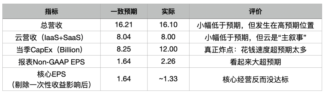 EPS指标没问题,利润主要被一次性收益“美化”,营收、云收入只是轻微偏差;真正拉开差距的是CapEx(12Bvs8.25B)和核心盈利质量。而这两项,恰恰是“重资产转型期”市场最敏感的地方。