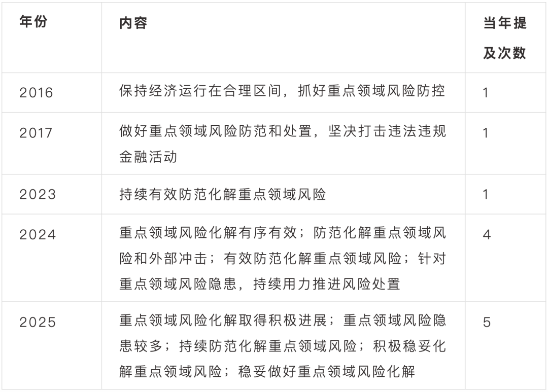 笔者梳理了自党的十八大(2012年)以来的14届中央经济工作会议,发现共有5届出现了“重点领域风险”,分别是在2016年、2017年、2023年、2024年、2025年的会议内容上。