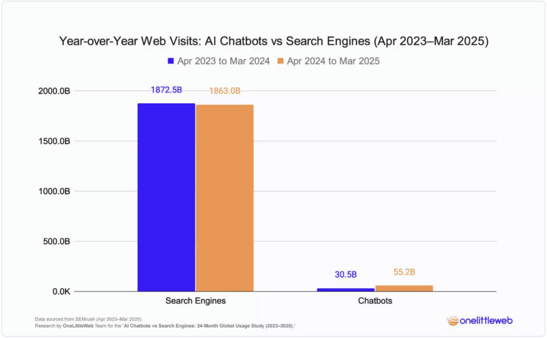 二者不是“你死我活”,而是互为补充,共同推高搜索体验的天花板。一份研究就显示,AI聊天助手流量爆发的时候,搜索引擎的体量并没有大受冲击。