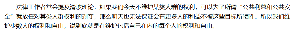 所谓的“进步主义”法学家心善,将让违法者过得更差的手段斥为“对权利的剥夺”,还大谈“今天剥夺他的权利明天就剥夺你的权利”的滑坡理论——当然他们会非常双标地批判“放松对吸毒的控制终会导致毒品合法化”是“滑坡谬误”。