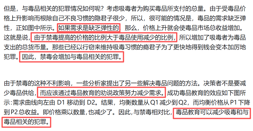 刚刚接触这种数学分析方法的懵懂大学生很容易被所谓的严谨逻辑唬住,从而拥抱颠覆常识的“科学结论”(去装逼)。然而,曼昆熟练地偷换了微观弹性和宏观弹性的概念:对于瘾君子本人,当然是不论用什么手段花多少钱都想吸一口,但对于整个社会,禁毒可以显著减少普通人接触毒品堕入深渊的可能,最终减少毒品犯罪总量。基于不存在的假设得出结论,再以此影响社会认知、改变社会政策,也是主流经济学的传统艺能了。