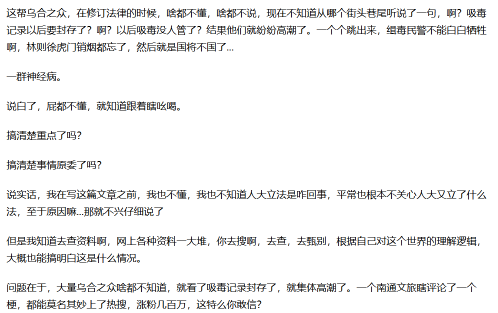 可笑的是,这些西方观念根深蒂固的人往往把“人性论”“客观规律”挂在嘴边,攻击社会主义的很多制度或号召,然而现在他们又不讲对激励做出反应这一最基本的人性了。或许他们心里也觉得这套逻辑太离谱,不约而同采取了“把吸毒和其他治安违法行为等量齐观”的诡辩术。
