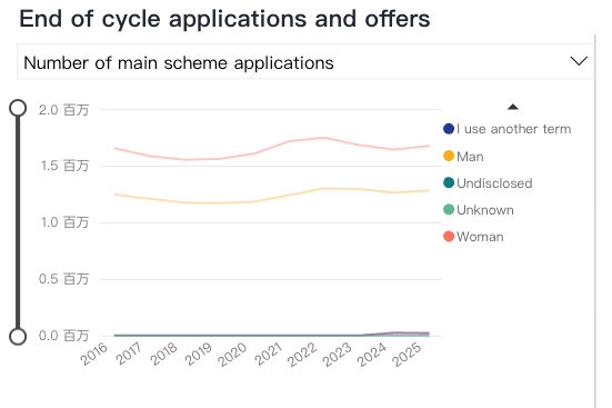 2025届,女性申请人数1,674,355,占比55.9%;男性申请者1,281,270人,占比44.1%。可以发现,女性占比更多的情况已经持续多年。