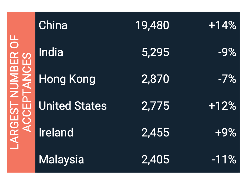 从录取学生的数量来看,中国大陆依然是最大的生源地,而且仍然是正增长,相比上个申请季增加了14%。排在身后的印度和中国香港,录取人数相比上一个申请季有所下滑。