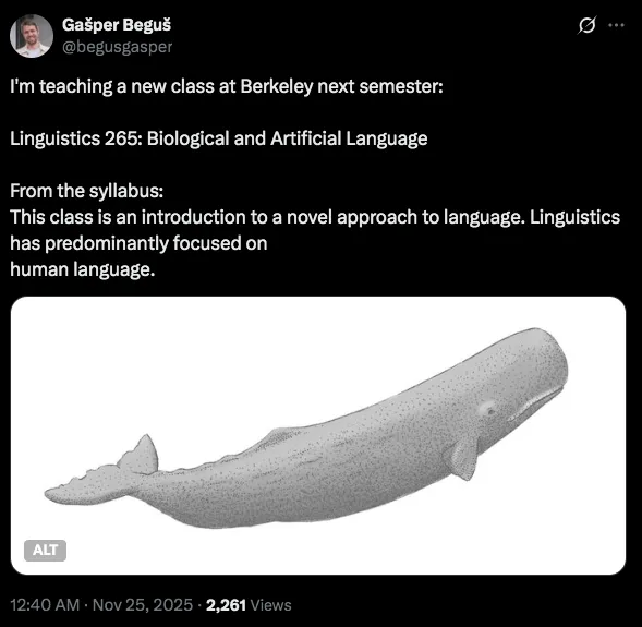 另外一位给我启发的人工智能和语言学的交叉研究者是加州大学伯克利分校的语言学家加斯珀·贝古什(Gašper Beguš),以及他的太太尼娜·贝古什(NinaBeguš),她是加州大学伯克利分校科技、医学与社会研究中心的研究员兼讲师。加斯珀·贝古什主要和团队一起观察抹香鲸在自然栖息地的行为,并通过“鲸类翻译计划”(CETI项目),运用人工智能和其他先进技术,尝试解读抹香鲸的“元语言”,再把这些发现应用于人工智能和跨物种的交流和通信。