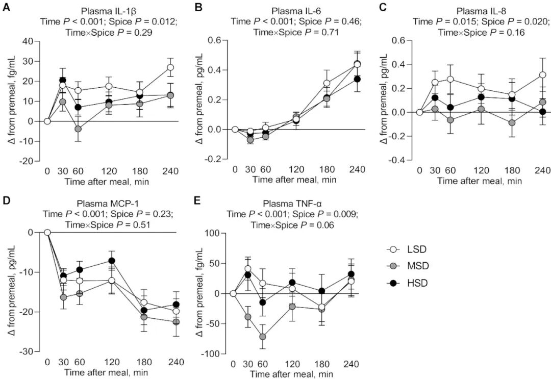 MSD四周后,餐后血浆中的促炎症因子 IL-1β、IL-8、TNF-α 的水平显著低于食用低剂量香料饮食。