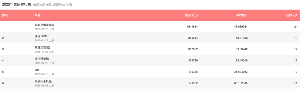 这话一点不夸张。国家电影局截至12月13日的数据显示,全年总票房已经超过了500亿元,观影总人次是11.94亿。票房前五名里,《哪吒之魔童闹海》和《疯狂动物城2》,加起来接近190亿元。
