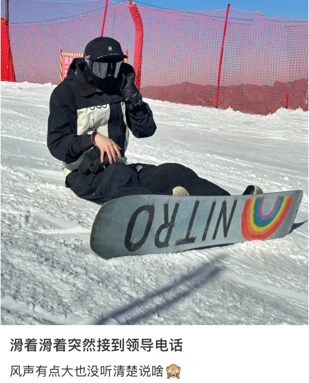 此外,在冬日爆火的雪场,“雪道接电话,缆车回信息,晚上捧着电脑加班”也是时刻上演的打工人日常。