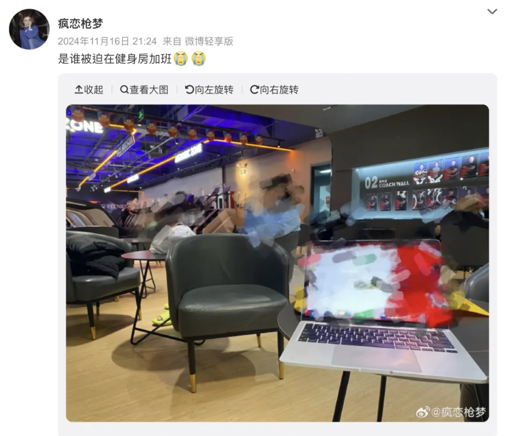 时间久了,健身房的拉伸区、休息区都开始变成办公区,长满了临时开会的、做表格的,甚至商务会谈的打工人。
