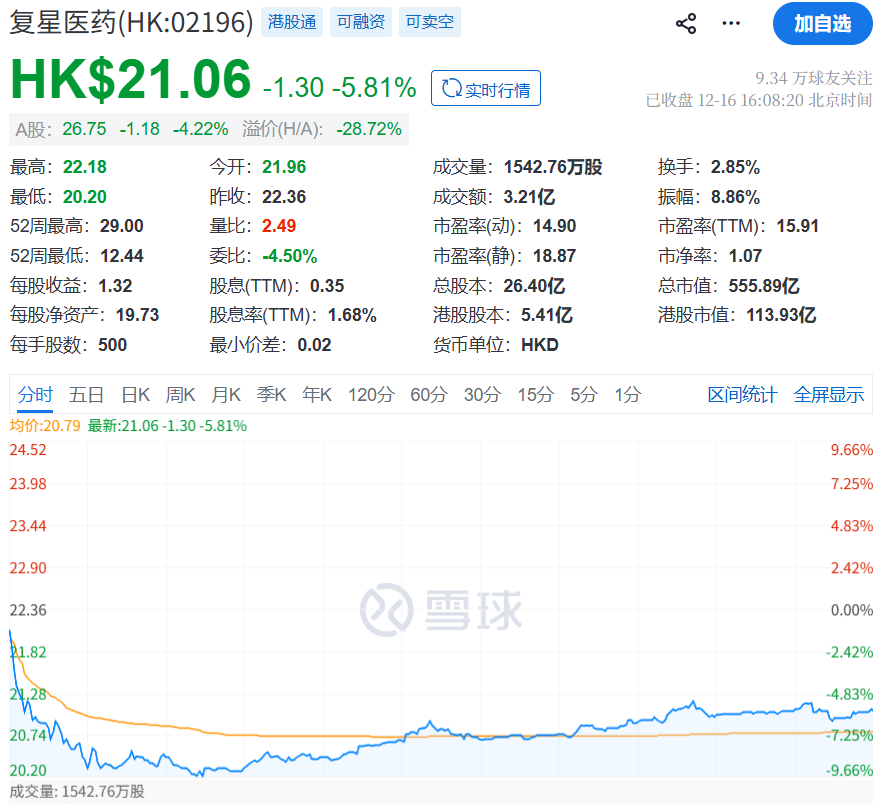 复星医药港股一度大跌近10%,但截至收盘,其股价报21.06港元/股,下跌5.81%。