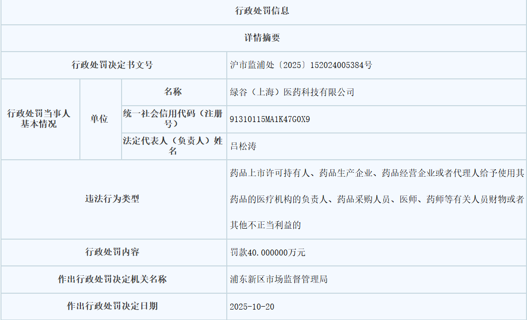 据了解,绿谷医药已于2025年10月24日缴清这笔罚款。
