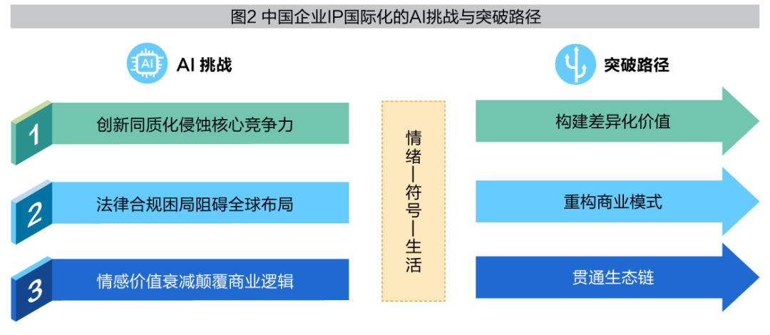 这些挑战直指IP产业命脉。当AI技术效率碾压人文温度,当合规成本吞噬创新空间,当全球市场竖起算法藩篱,中国IP出海亟待构建“技术为用,文化为体”的新范式。为此,我们提出三项战略:差异化价值构建、商业模式重构及生态链贯通(见图2)。